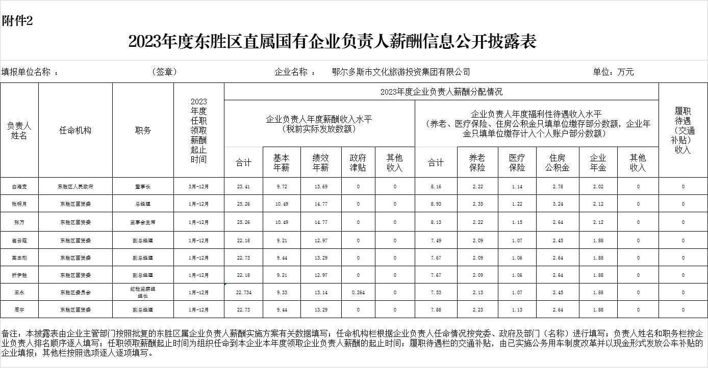 2023年度東勝區直屬國有企業負責人薪酬信息公開披露表